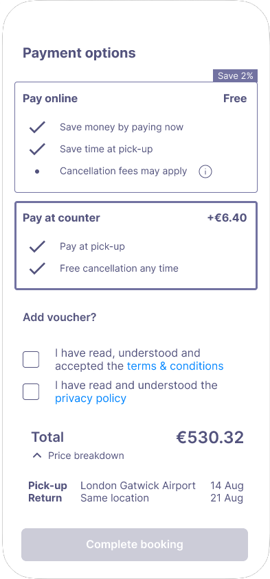 User testing also displayed that transparency of payment was of critical importance. It was a massive red flag for users to find hidden fees applied at the end of the booking process, resulting in user frustration. Payment transparency is a strong priority in my design. Users are given access to a payment breakdown throughout the process. Additionally, multiple payment options are provided; paying online or in-person, and the differences in cost between each option.