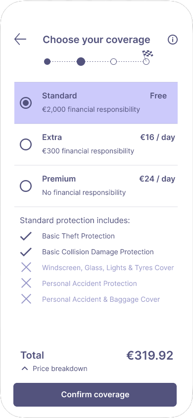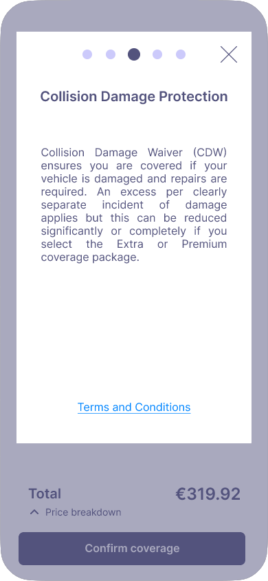 My research and analysis consistently highlighted that users were struggling with understanding insurance/coverage options. The information regarding what types of coverage packages they could select from was unclear as apps often used technical industry jargon which users could not understand. This was an unavoidable area of the booking process, so I clearly divided the various packages and indicated what is applied for each available selection. A clear information icon at the top of the screen, once tapped, opens an overlay which explains the insurance terms in further detail for the user.